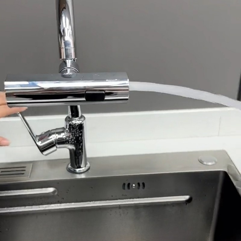 Den höga, bågformade designen och 360° roterbar funktion ger gott om utrymme i diskhon. Utrustad med utdragbar spruta och varm-/kallvattenkontroll för exakt hantering och kraftfullt vattenflöde.